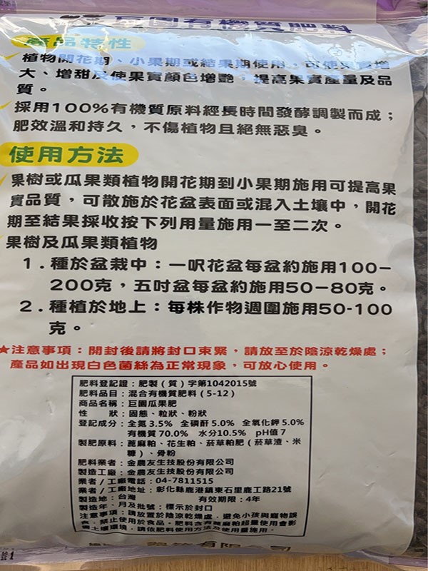 注意事項 : 請放置於陰涼乾燥處,避免小孩與寵物誤食,禁止使用於食品。肥料含有篦麻粕超重使用會影響土壤環境,請依肥料使用方法及使用量施用。