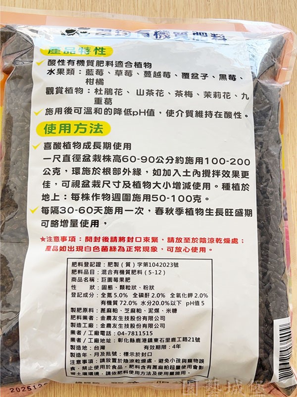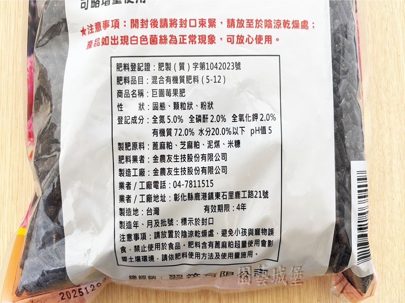 【注意事項】請放置於陰涼乾燥處,避免小孩及寵物誤食,禁止使用於食品。肥料含有蓖麻粕超量使用會影響土壤環境,請依肥料使用方法及使用量施用。