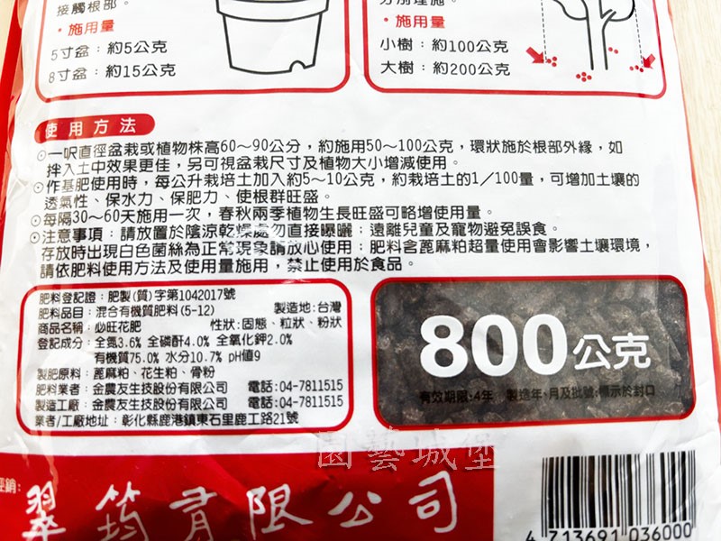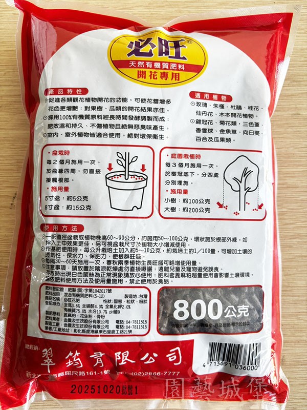 ※ 採用天然有機質肥料,肥效溫和持久無惡臭。促進各類觀花植物 開花的功能,可使花蕾 增多花色更增豔;對果樹、瓜類的開花結果亦佳。