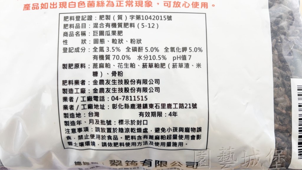 注意事項 : 請放置於陰涼乾燥處,避免小孩與寵物誤食,禁止使用於食品。肥料含有篦麻粕超重使用會影響土壤環境,請依肥料使用方法及使用量施用。